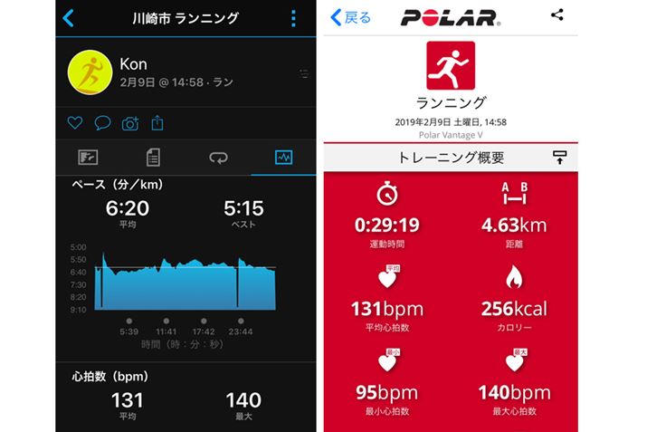 片手に「ForeAthlete 935」(左)、もう片方に「Polar Vantage V」(右)を着用してランニング。平均心拍数および最大心拍数が見事に一致している