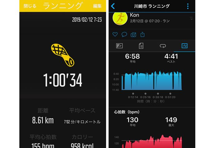 片手に「Suunto 9 Baro」(左)、もう片方に「ForeAthlete 935」(右)を着けてランニング。平均心拍数の比較になるが、25以上離れてしまっている
