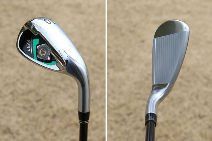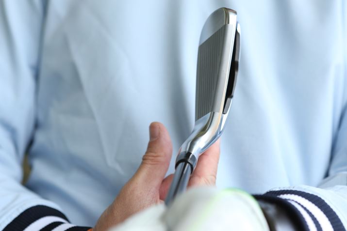 最後はアイアン。とても強いグースネックになっています。これだけ強いグースネックのアイアンを久々に見ました……。ブレードも厚く、“つかまりがよさそうで芯を外しても当たり負けしなそう”な、やさしさを前面に押し出した「顔」になっています。構造はポケットキャビティ、アイアンとしては非常に深い奥行きを持ち、重心を極力深くして打点のミスに強いモデルに仕上がっていますね。