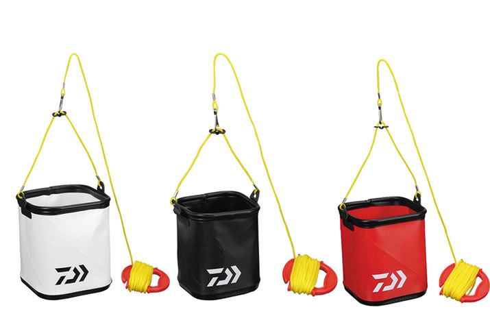 8mのロープが付属する水汲み用バケツ。本体をひねって回転させるとコンパクトに収納できる。カラバリは白、黒、赤
