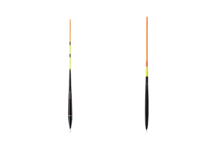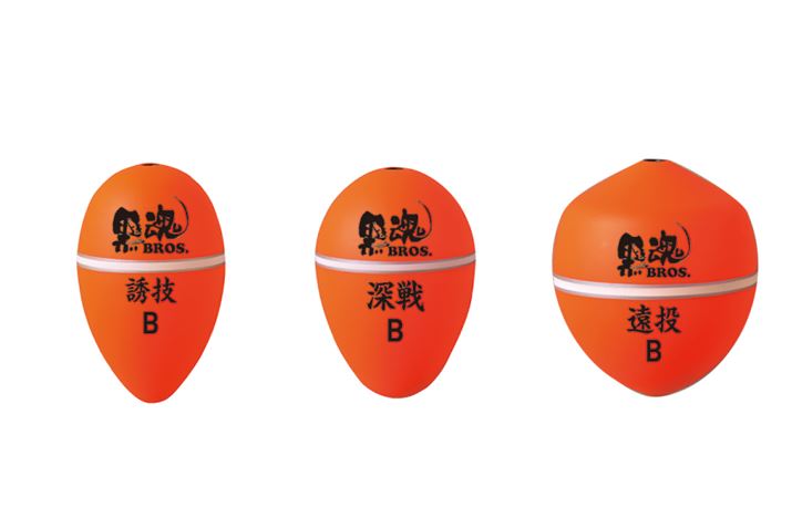 しかけの投入ポイントに合わせたウキを使うのがベスト。複数種類持っておくのも手だ。狙ったポイントでアタリを待つのにすぐれた「黒魂Bros 誘技(左)」、深場狙いにすぐれた「黒魂Bros 深戦(中)」。遠投性能抜群の「黒魂Bros 遠投(右)」などがそろい、それぞれ重りに合わせたモデルがラインアップされている
