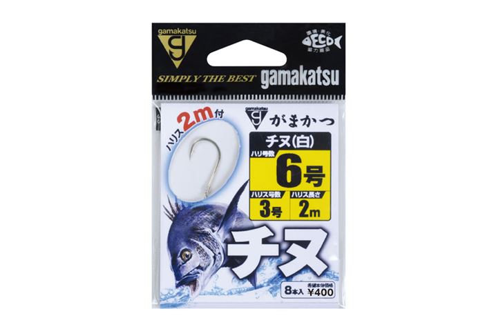 2mのハリスがセットされたチヌ針。針のサイズは1〜6号まで6種類がそろっている。1〜4号は9本入り。5〜6号は8本入り