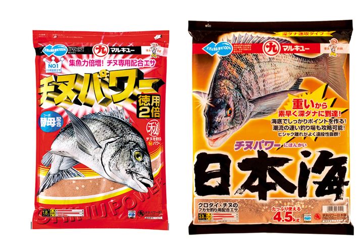 まき餌を配合する際のベースとなる餌の定番が、「チヌパワー(写真左)」だ。酵母、オキアミ、麦の配合でチヌ(クロダイ)を引き寄せる。粘りがあり、遠投にも適している。「チヌパワー日本海(写真左)」は、水深の深い釣り場で本領を発揮する製品。比重が重いので「チヌパワー」よりも落下速度が速く、より深場でバラけるのだ
