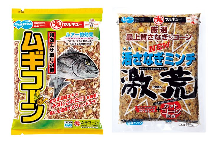 ベース餌に配合することで効果を高めるブレンド餌。「ムギコーン(写真左)」は、まき餌がバラけた際にコーンがヒラヒラと落下して食い気を高める。「ニュー活さなぎミンチ激荒」は、針餌に「活さなぎ」を付ける際に効果を発揮する
