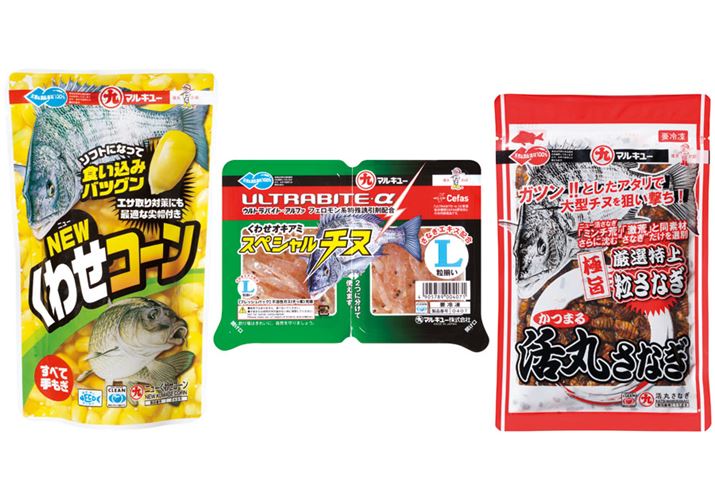 針餌には基本的に、まき餌にブレンドした餌と同じ種類でしっかりしたものを使う。「ニューくわせコーン(写真左)」は、アミノ酸を添加したソフトな仕上がりのコーン餌。「くわせオキアミスペシャルチヌ(写真中)」は、食い込みのよさを重視したチヌ(クロダイ)専用のオキアミ。チヌが好む2つの成分を配合している。「活丸さなぎ(写真右)」は、上質なさなぎから、水に浮かないものを厳選したもの