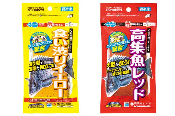 針餌として、まき餌にブレンドした餌とは別に用意しておきたいのが、確かな結果を残している練り餌。「高集魚レッド(写真左)」は、魚が好むアミエビやニンニクをたっぷり配合。「食い渋りイエロー(写真右)」は、視認性の高い黄色が濁り潮や深場でも強力にアピール。アミノ酸やアミエビのほか、フェロモン系特殊誘引剤「ウルトラバイト・アルファ」を配合している