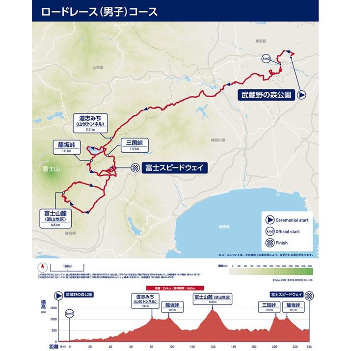 自転車ロードレースのコースは、東京都調布市にある武蔵野の森公園をスタートし、静岡県の富士スピードウェイをゴールとしたもの。男子と女子で走行距離が異なり、男子のコースは約244km、女子のコースは約147kmとなっている。このコースには、国道413号(通称:道志みち)や「尾根幹」と呼ばれるロードバイク乗りに有名な路線も組み込まれており、かなり気持ちがよさそう。しかし、調べてみると、男子のコースの獲得標高(スタートからゴールまでの上った高さの合計)は約4,865mもある。