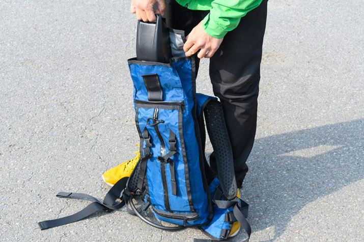 バックパックに交換用のバッテリーを収納。重量約3kgのバッテリーを背負って走ることとなる。ちなみに、バッテリー(X0N-82110-10)の価格は74,520円(税込)