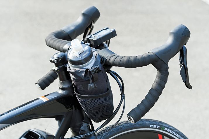 フレームに装着したボトルケージに飲み物を入れておくという手もあるが、ハンドルに近いほうが少ない動作で水分補給ができる。ちなみに、ボトルの中に入れたのは水ではなく、スポーツ飲料だ
