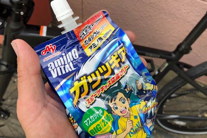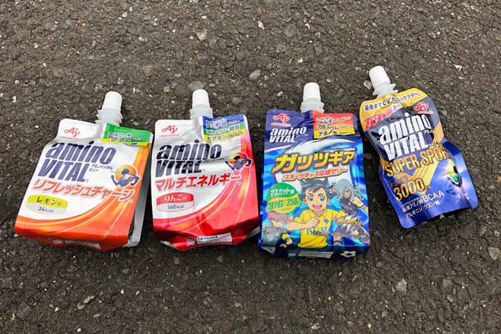 エネルギー補給のために、ゼリー飲料を4袋用意。筋肉のエネルギー源になり修復にも効果があるアミノ酸が入っているものをチョイスした