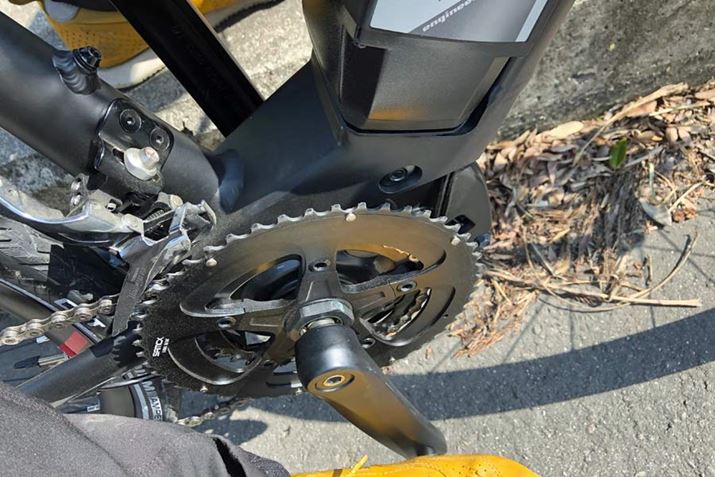 山道なので、基本的に登りが続く。アシスト機能だけで十分事足りていたので、ここまでは使わなかったフロントのインナーギアも導入。軽いギアで回すペダリングを心がけていく