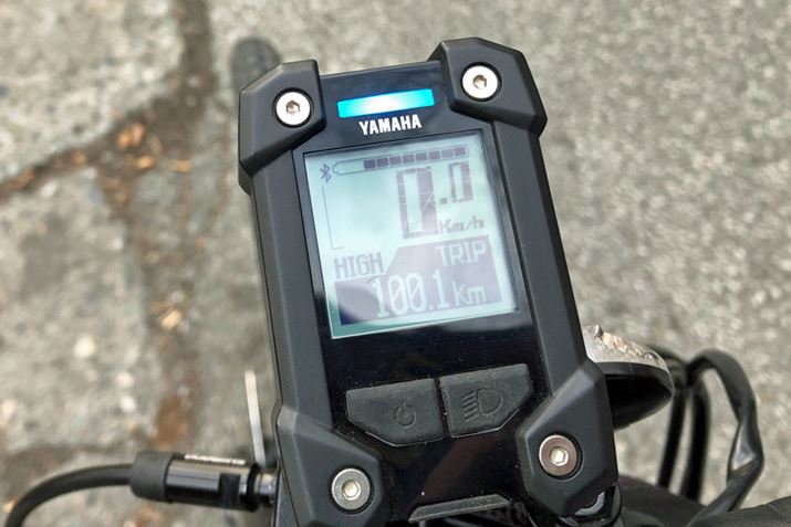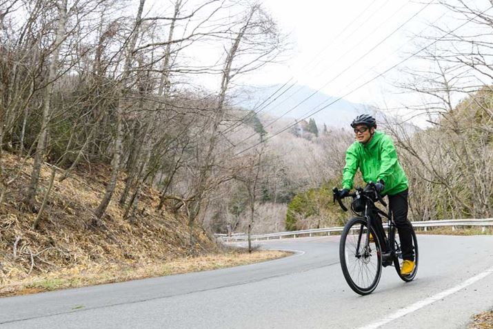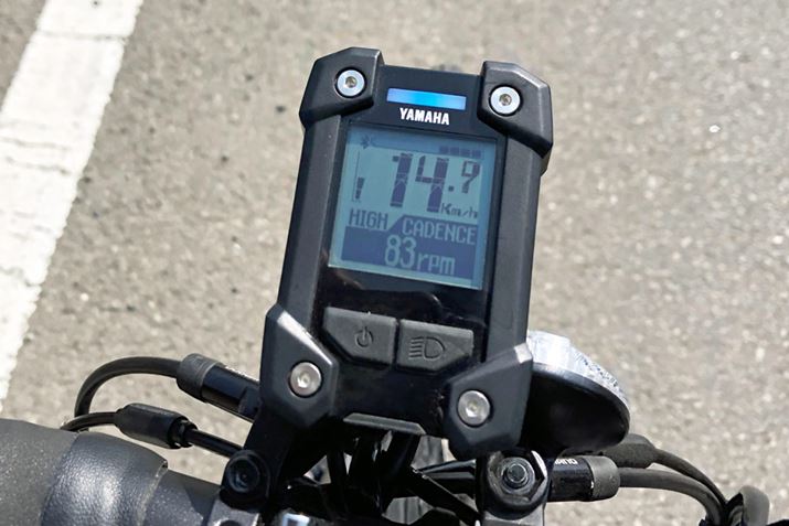 お昼休憩のあとは「道志みち」を進む。基本的には登りだが、少しだけ下りがあったり、平坦な道もあるのでまだ気持ちには余裕がある。でも、アシストモードはずっと「ハイモード」。登り坂では極力筋肉へのダメージを減らせるように、フロントのギアも軽くし、ひたすらペダルを回すことに集中。YPJ-ERに装備されている速度などを確認できる「コンパクトマルチファンクションメーター」にはケイデンス(ペダルの回転数)が表示できるので、ロードバイクのライディングでは1番疲れにくいと言われる回転数90rpmくらいを意識し、70rpmを下回らないように注意した。登り坂でこの回転数を維持するのは普通のロードバイクでは厳しいが、e-Bikeなら可能だ。
