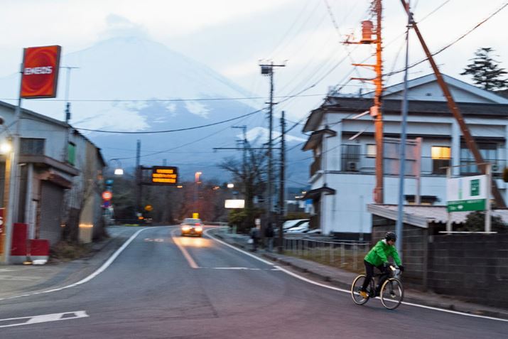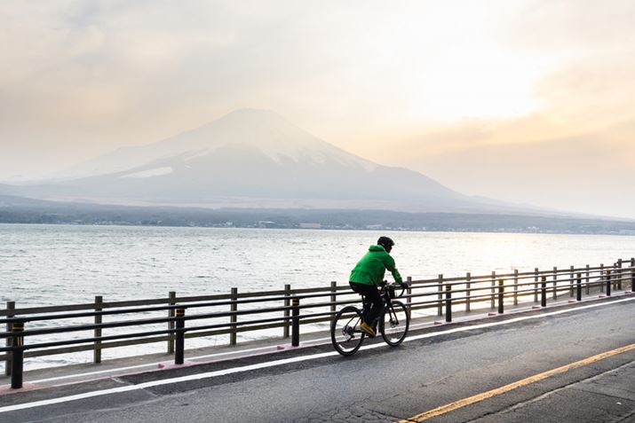 時間は17時ジャスト。夕日を浴びる富士山を見て、もうここをゴールとしてもいいのではないかという気持ちがわき上がる。そう、正規のコースではここがゴールではないのだ。山中湖を1周し、さらに籠坂峠を越えなければならない。はっきり言おう。40代筆者の体力はかなり限界に近づいている。自転車からおりて、足をついた途端、ヒザがガクッと折れそうになったほどだ。だが、仕事だからここまで来たら、もう走りきるしかない!