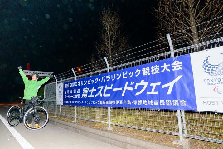 そして、ようやく富士スピードウェイが見えた。しかし、これで終わりではない。男子のコースなら、ここから三国峠や富士山麓を回って富士スピードウェイに戻ってこなければならず、女子のコースでも富士スピードウェイの周囲を1周しなければならないのだ。時間的にも体力的にも精神的にも男子コースはムリ。なので、最後の力をふり絞り、女子のコースを走りきることにした。なお、本番のレースでは、富士スピードウェイの中も走るのだが、今回は中に入ることができなかったので、入り口をゴールとする。