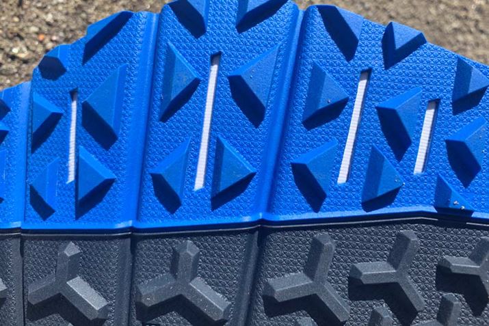 アウトソールパターンは、三角形とテトラポッド状のスタッドを組み合わせている。あらゆる路面で高いグリップ性を発揮