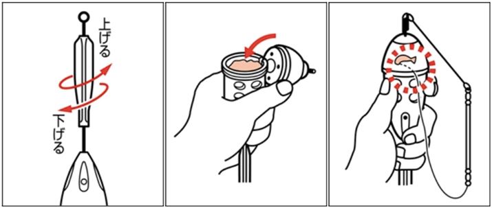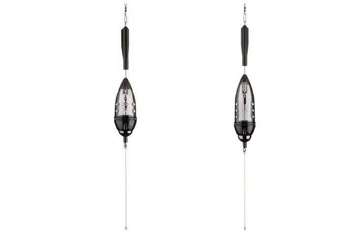 カゴの上にある「清流ウイング」の上げ下げで、コマセが出る量を調整できる。針餌は、図右のようにカゴの中に入れて投げると、コマセのオキアミと一緒に針餌が流れ出るのでより効果的に魚に食わせられる