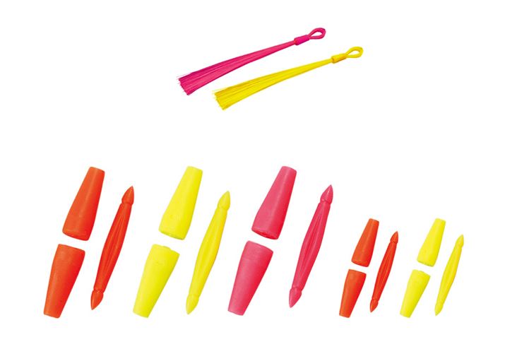 遠投用の遊動ウキ。オモリ負荷はジェットカゴのオモリと同じく、6、8、10、12、15号の5通りをラインアップ。左下の写真は羽根が折れた際などの交換用の羽根