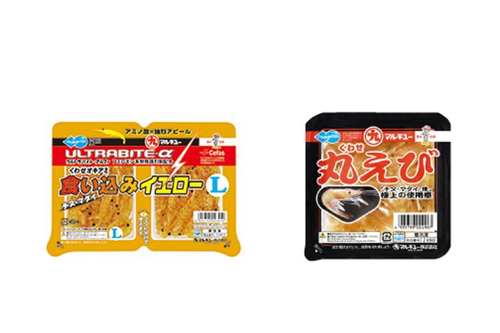 写真左は、視認性の高いイエローに加工したLサイズのくわせオキアミ。写真右は、平均55mmの本物の大型エビを加工した真鯛狙いの針餌