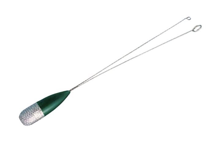 投げ用のオモリは、遊動式の天秤がベスト。針金部分をL字型に曲げて、輪の小さいほうから大きいほうへと道糸(ライン)を通し、針仕かけを付けよう