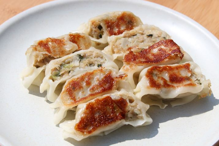 最後に作るのは、焼き餃子。深さのある鉄板とフタが付属するGRID グリルSだから、蒸し焼きができます。焼き餃子といっても、市販のチルド餃子を使うので準備は簡単。でも、ビールなどの酒のアテに最高です!