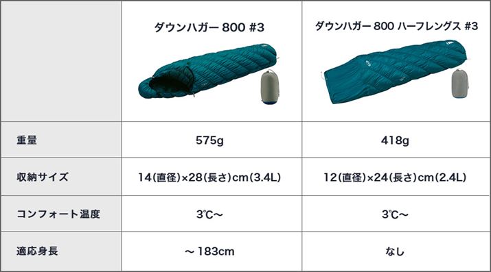 では、実際に「ダウンハガー800 ハーフレングス #3」のスペックをチェックしていこう。まずは、同シリーズの中でもっとも似た「ダウンハガー800 #3」とカタログ値を比較してみる。「ダウンハガー800 #3」は「ダウンハガー800 ハーフレングス #3」の全身バージョン。全身に中綿が入り、フードも付いている一般的な形状のタイプだ。