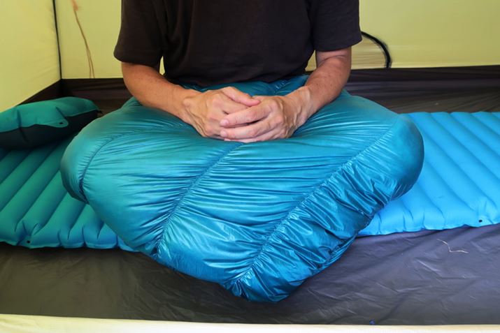 伸縮性が高いので、スリーピングバッグに入ったままであぐらをかくことも可能。これなら寒い時期でも、下半身を保温したままテント内でくつろげる