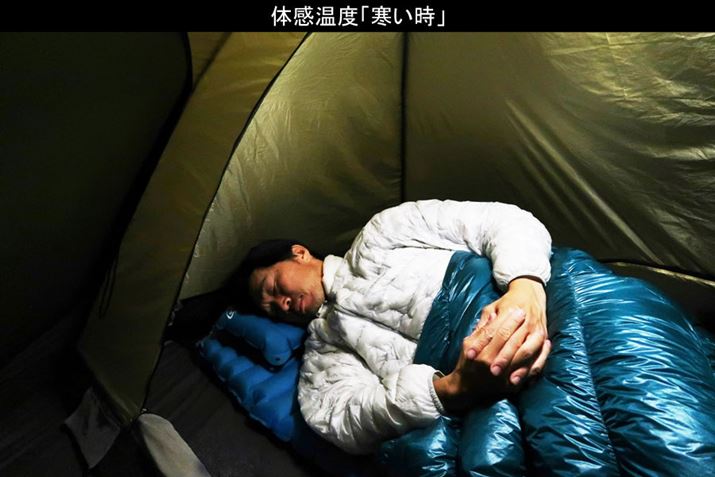 今回テストした就寝時の気温は約12℃。正直なところ、防寒着を着た状態では暑くて眠る気になれず、当初は「暑い時」のように、Tシャツ1枚で胸から上をスリーピングバッグから出して眠りに入った。しかし、気温が下がった夜半には寒くなり、Tシャツのまま「ちょうどよい時」の状態に。その頃の気温はおそらく7〜8℃くらいだったと思われるが、僕にはちょうどよかった。