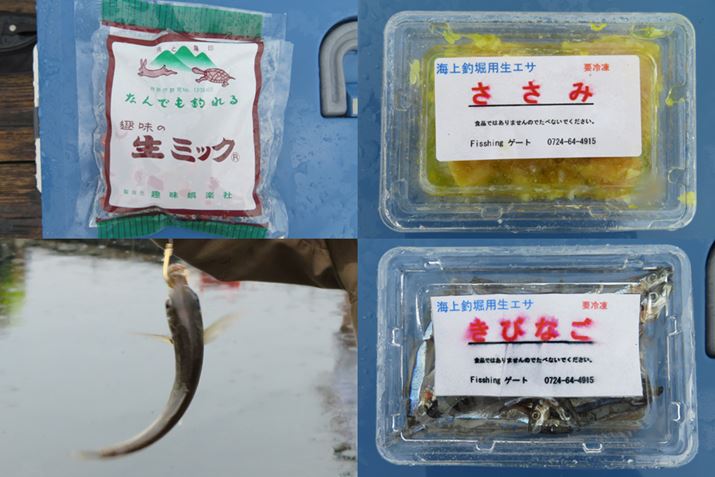 エサは現地販売品を調達。タイ用にささみ(右上)、シマアジがよく釣れるという「生ミック」(左上)、青物用にきびなご(右下)を購入。このほか、ブクブク(エアーポンプ)を使用して活き豆アジ(左下)を用意した(活きアジは現地で売っている場合と品切れの場合があるので、使いたい人は事前に要確認)