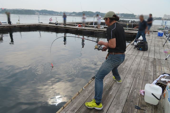 釣り場は、生けすひとつにつき最大12人で使用。全員の用意があらかた整うと、スタッフさんの合図で一斉に釣り開始。筆者も仕かけを生けすの中央付近に投入すると、すぐにウキがゆっくりと沈み始めた!? 半信半疑で合わせると、ヒット〜!