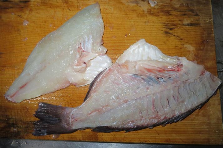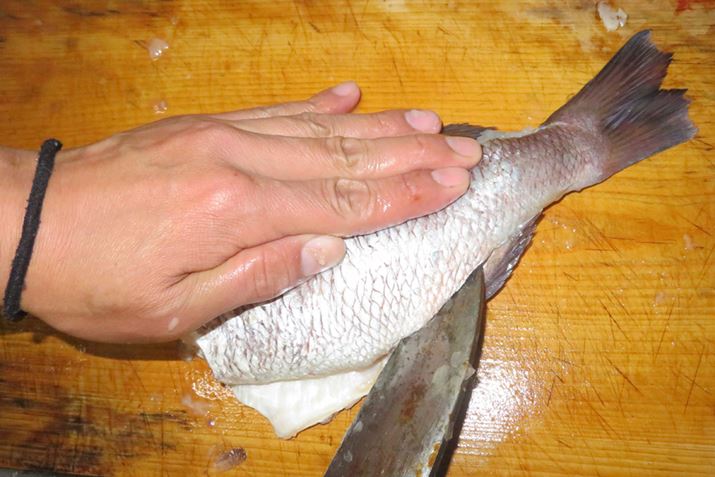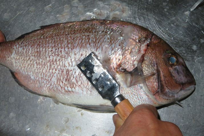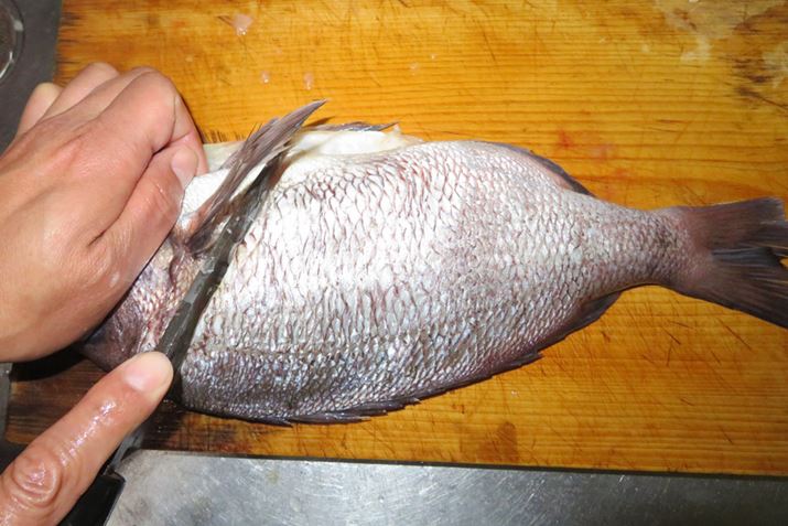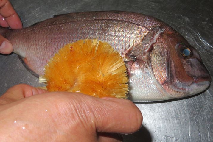 まず表面を真水で洗い、ウロコを取る。背びれが手に刺さることがあるので、注意しながらヒレの裏や頭のウロコもていねいに取っておこう