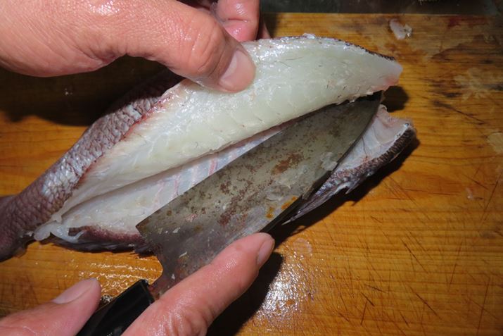 腹側、背中側と、中骨に沿って、ゆっくりと包丁を入れていく。一気に切ろうとせず、何回か包丁を引いてていねいに切ろう
