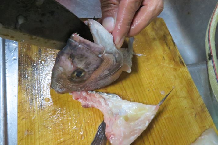 ウロコ、エラ、ワタを取ってキレイに水で流したら、頭のうしろから胸ヒレにかけて包丁を入れ、頭を落とす。一気にやろうとせず、片面ずつ切ればそんなに力を使う必要はない