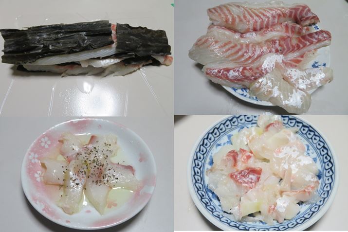 皮を引いて身だけにすれば(右上)、お刺身(右下)やマリネ(左下)が簡単に! 身を昆布で挟めば、ねっとり濃厚で旨みが詰まった昆布締め(左上)に
