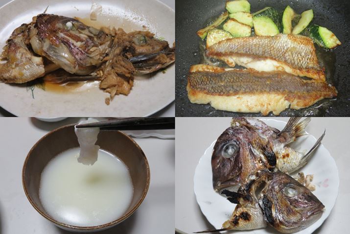ほかにも、ムニエル(右上)、カブト焼き(右下)、カブト煮(左上)、濃厚潮汁(左下)を作成。どれも大満足のおいしさだった