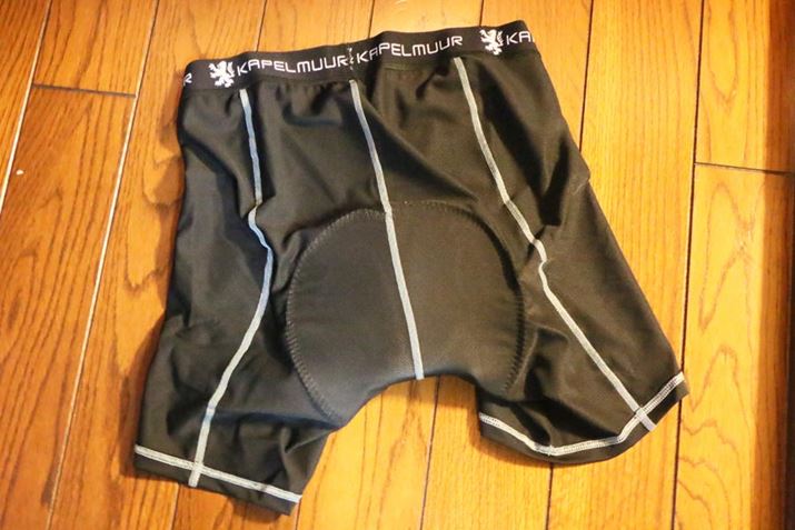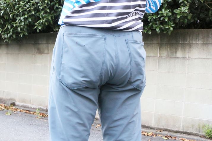 レーシングパンツ+普通の服に見える自転車用のズボンを履いた状態。クッションが装備されているとはいえ、レーシングパンツは体にフィットした作りなので、それほどお尻の盛り上がりは気にならない