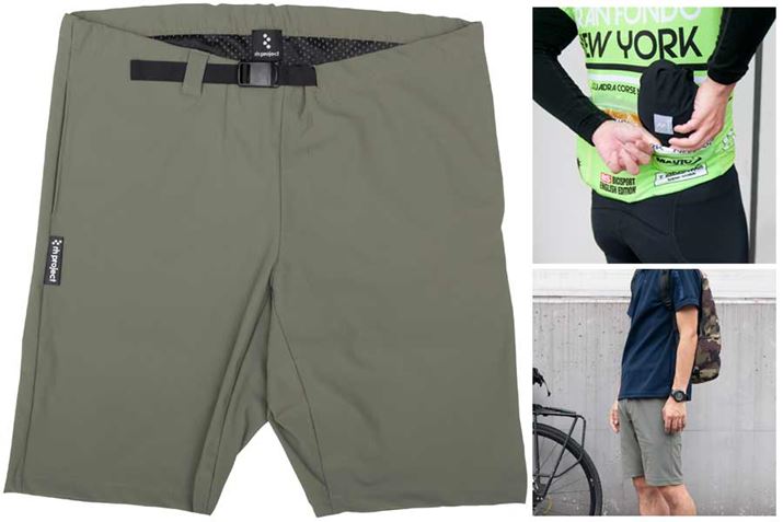 単体で履いてもまったく問題ないが、本製品はレーシングパンツで走り、輪行で電車に乗る際やお店に入る時などに普通のパンツを履きたいというニーズに応えられるように作られたハーフパンツ。ポケットを引き出し、パンツ本体を丸めるように入れれば収納できるバッカブル仕様となっており、ジャージのポケットに入れて携帯することも可能だ。前述の「ステテコショートパンツ」も軽量で持ち運びしやすいが、本製品のほうが40gほど軽く、収納ポーチに出し入れする手間もないので、素早く脱ぎ着できるだろう。収納ポーチを紛失する恐れがないものいいところ。なお、通気性やストレッチ性が高いほか、触るとヒンヤリと冷たく感じる「接触冷感」素材を採用しているので、快適さも申し分ない。