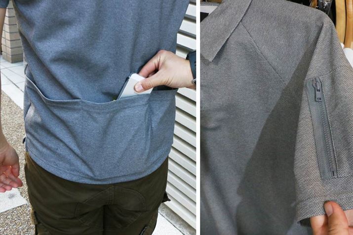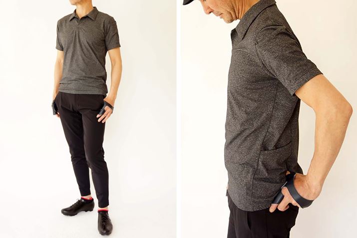 ここまでポロシャツばかりだったので、機能性の高いTシャツもひとつ紹介しておこう。本製品は、異なる色の糸をひねり合わせた糸「杢糸(もくいと)」を採用し、生地を単色ではなくムラが出る風合いとすることで、丸首Tシャツでありがちな“肌着っぽい”イメージを払拭。デザインのポイントとして、ICカードがすっぽり入るサイズ感の胸ポケットも装備されている。ただし、前傾姿勢となる乗車時は中身が落ちる可能性があるので、背面にある3つのポケットを利用するようにしよう。