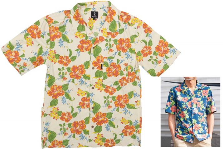 ハイビスカス柄はレーヨンを加えることで発色をよくし、アロハシャツっぽい質感に近づけているのだそう。【素材】綿60%、レーヨン40% 【カラー】ホワイト(色名はホワイトだが、実際はベージュ系)、ネイビー 【サイズ】S、M、L
