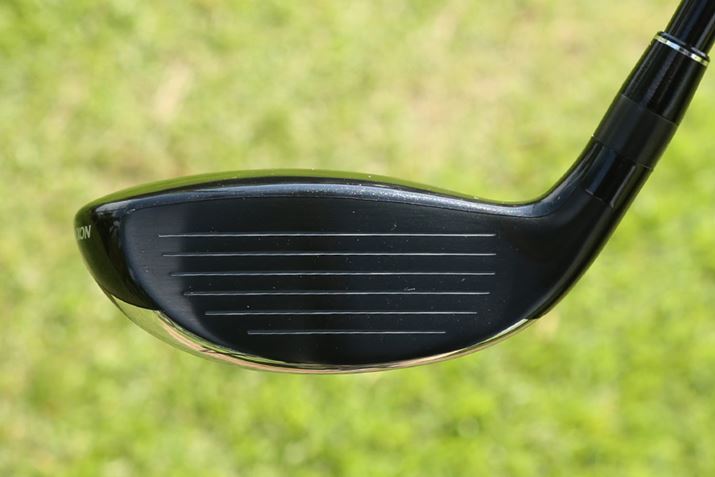 フェースも黒く見えるよう処理がされていて、かなり精悍な雰囲気を醸し出していますね。ヘッド形状はオーソドックスなウッドタイプで、フェース側のクラウンに段差を持たせているのが特徴です。フェースのトウ側の処理が開いて見えるような形になっており、上級者が嫌う左に飛ぶイメージを持たせない工夫がいいですね