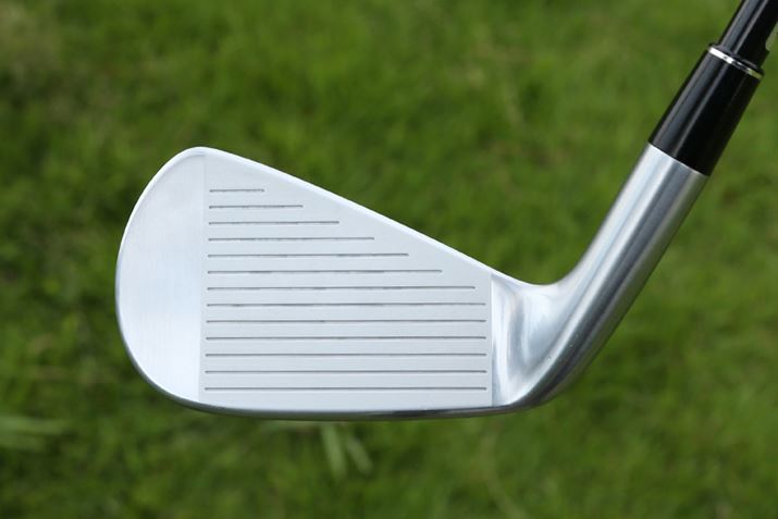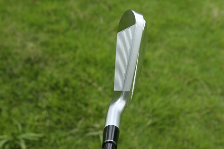 トップブレードが厚めに設計されていますが、きれいなアスリート好みのきれいな顔。ロフトの立った番手はバックフェースの張り出しがトップブレードの右から目に入りますが、ミラー仕上げにすることで気にならないような工夫がなされています