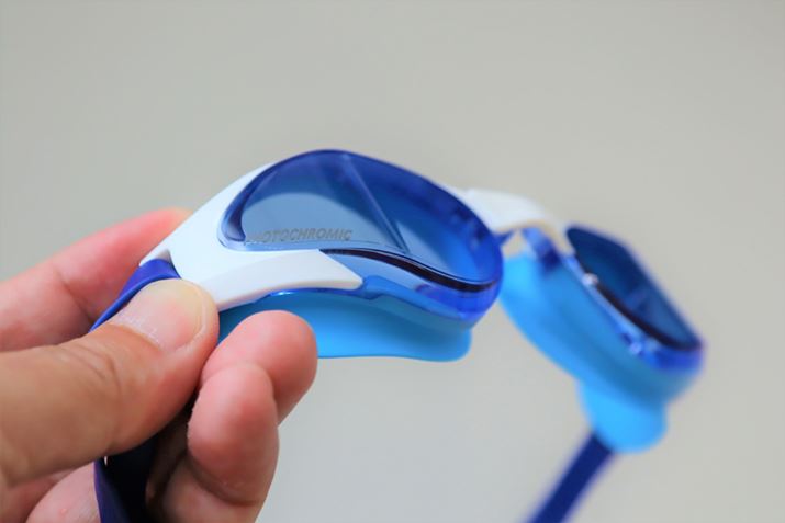本製品の調光レンズは、カラーが変わるだけではなく、水の抵抗を低減した「カーブレンズ」仕様。ほぼ180°視界の左右の端まで見渡すことができる。また、レンズが顔の形状に沿うようなカーブを描いており、フィット感も高い。
