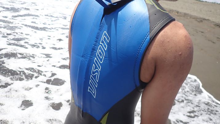 今回テストした「MEN'S SLEEVELESS VISION」は、47,000円(税別)という、初心者でも手に入れやすい価格でありながら、素材のやわらかさや使い勝手のよさが体感できる1着。一般的な低価格帯のウェットスーツは、伸縮性が少なく、素材が硬いことが多い。しかし同モデルは、スイム時の動きを妨げることなく伸縮し、しかも素材がやわらかく着脱しやすい。スイムからバイクに移るトランジション(種目切り替え)の時間も競技時間に含まれるのがトライアスロンなので、ウェットスーツの着脱のしやすさは重要なポイントになる。
