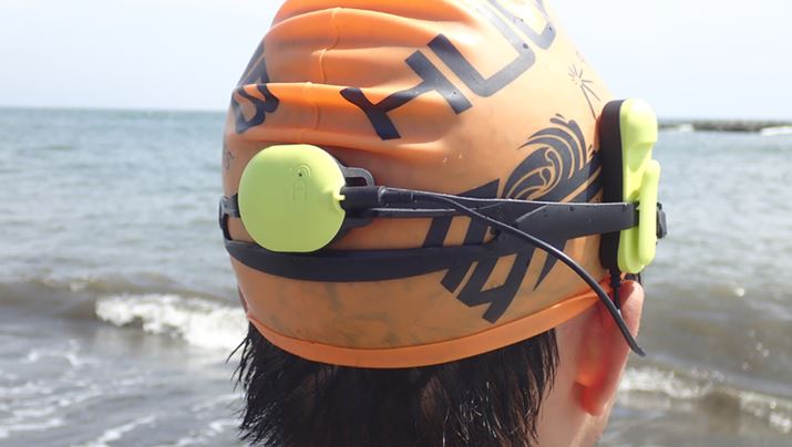 Platysensの 「MARLIN」は、骨伝導スピーカーを通じて、泳いだペースや距離などの情報をスイマーへ伝えるトレーニングデバイス。プールで使用する場合は、加速度センサーがクロールや平泳ぎなどの泳法を検知するだけではなく、ターンの回数によって泳いだ距離を測定。OWSの場合は、GPSセンサーによって距離を測定し、スイマーに伝えてくれる。
