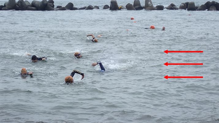 写真のスイマーたちは、沖のブイからまっすぐ陸地に向かって泳ぎたいのに、潮の流れによって左に流されてしまっている……。蛇行して泳ぐと、体力や時間をムダに消耗・浪費してしまう