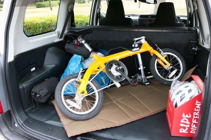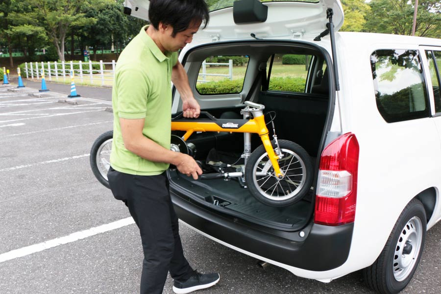今回は、トヨタ「プロボックス」の荷台に積んでみた。「アウトランクe」のフレームは折りたためないが、サドルを上げたままでも問題なし。セダンタイプの車種にも余裕を持って載せられる