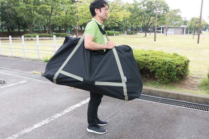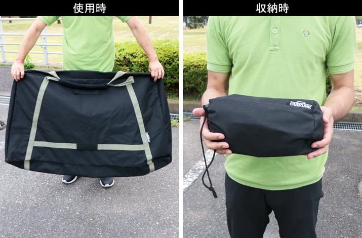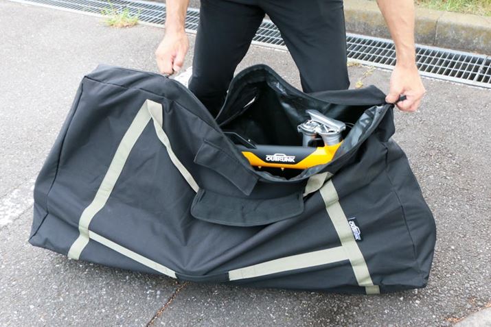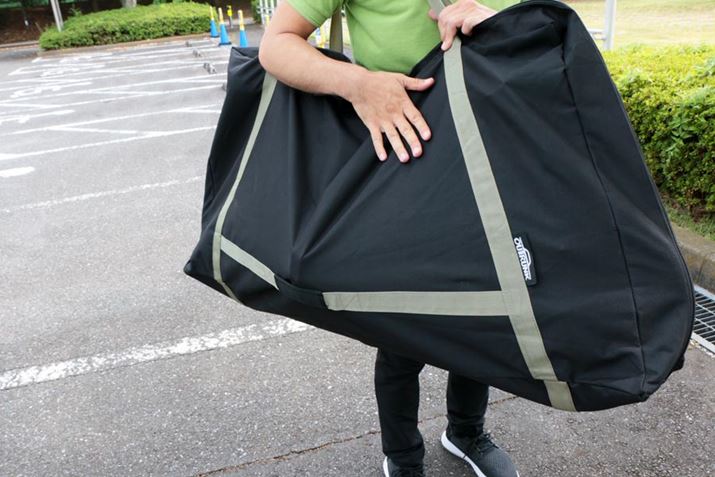 今回使用する輪行バッグは、「アウトランクe」の専用のもの(メーカー希望小売価格2,980円/税込)。使用時のサイズは大きいが、収納袋に入れれば小さくなるので持ち歩いてもそれほどじゃまではない