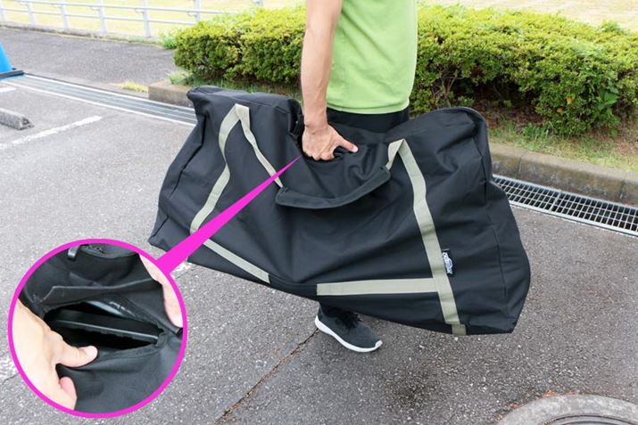 ちなみに、この「アウトランクe」の専用輪行バッグは車体に装備された取っ手を持って運べるようにもなっている