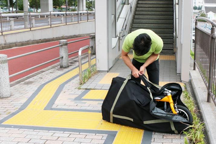 電車で輪行する際は、自転車全体をおおうことが鉄道会社の規則となっているので輪行バッグに入れよう