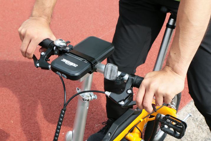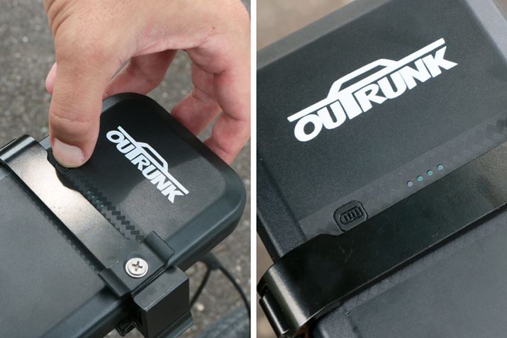 ハンドル中央にあるのが、「アウトランクe」の動力となるモバイルバッテリー(容量4Ah)。満充電で、最長24kmアシスト可能となっている