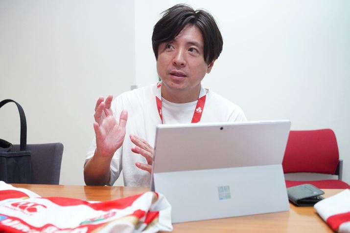 カンタベリーオブニュージーランドジャパン 事業部長の石塚さんは、代表チームに帯同して選手の意見を開発現場に反映させてきました。新しいジャージのデビュー戦は大変に緊張するとのこと